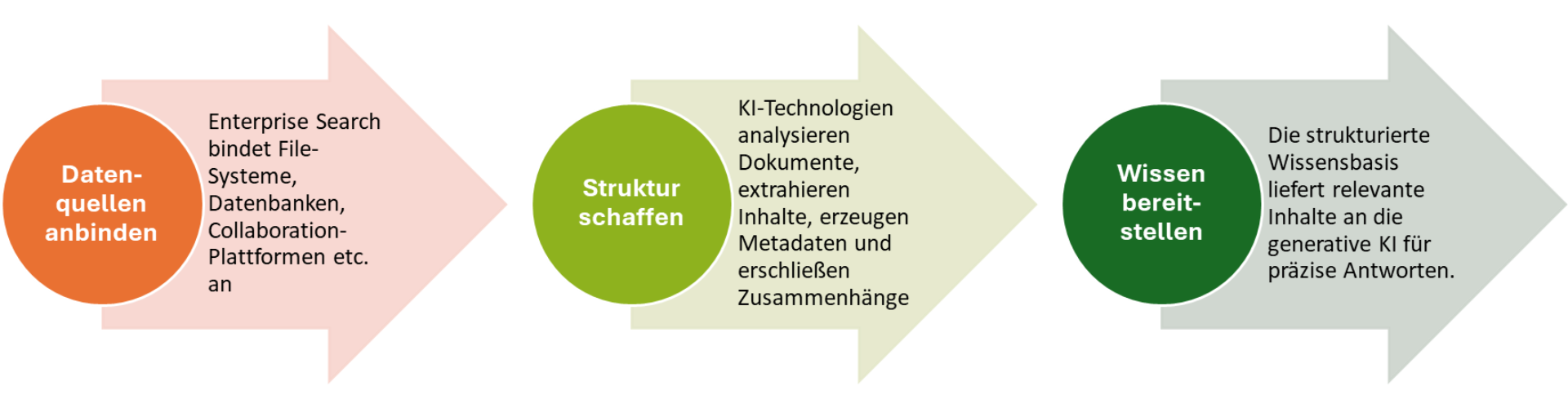 Diese Beispiele zeigen: Die Informationen sind vorhanden – aber das Unternehmen kann sie aufgrund ihrer fehlenden übergreifenden Kontexte und ihrer Vielfältigkeit nicht nutzen. Genau hier setzt intelligente Enterprise Search an. Sie verwandelt unstrukturierte und fachlich diverse Inhalte in kontextualisierte Informationen, die sich effizient durchsuchen und weiterverarbeiten lassen.