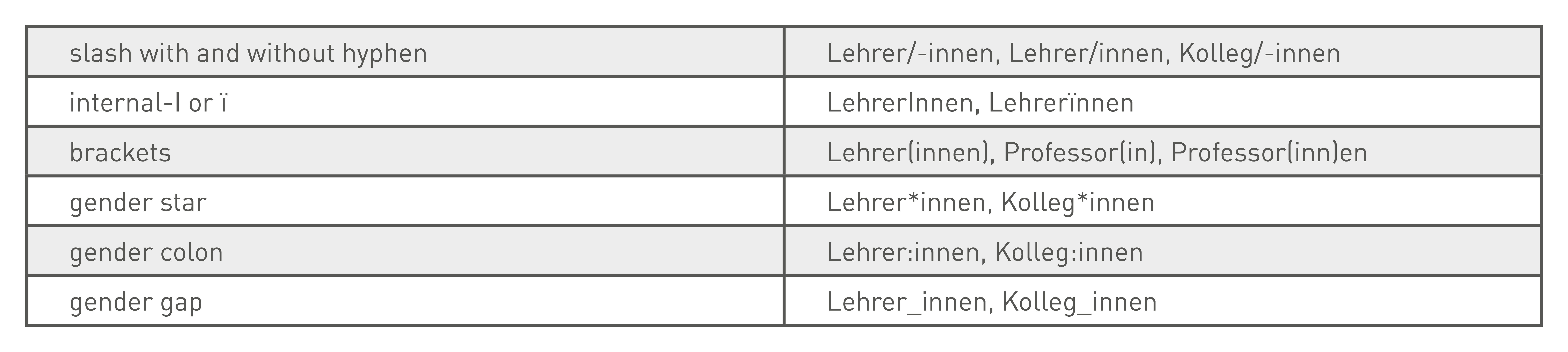 Linguistically, other phenomena occur in other languages with regard to gender spelling. In English, for example, we don’t register as many new word forms, but a change in language usage. There, terms that refer to a man or a woman have simply been replaced by neutral expressions, e.g.: