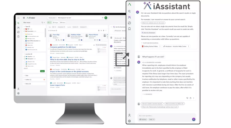 AI Search: iFinder retrieves the knowledge needed for work from drives, wikis, emails, specialist databases, and other data sources – in seconds and with automatic access control.